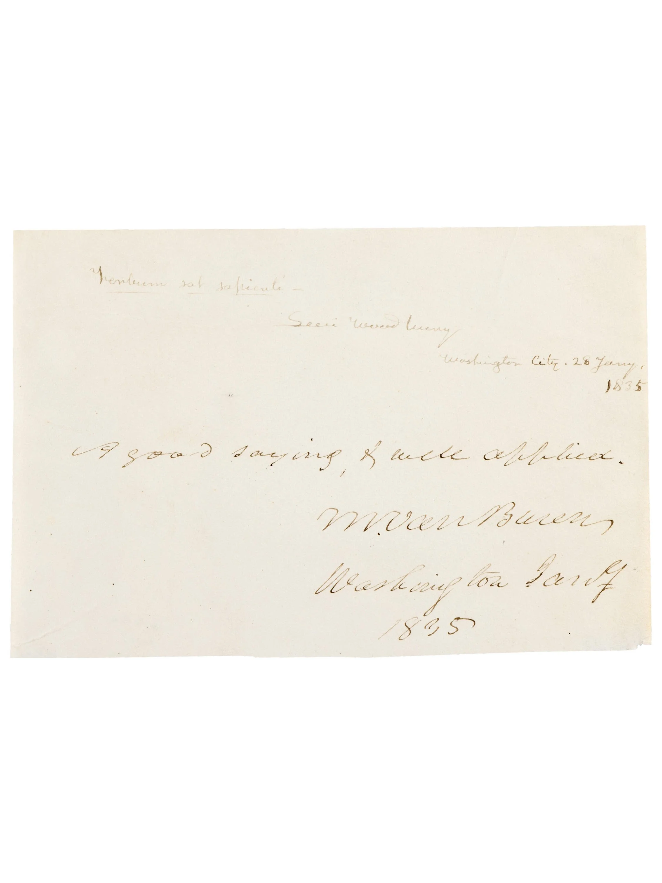 8th President. Handwritten note by Van Buren, written underneath the handwritten quote in another hand - "Verbum sat sapienti," - a Latin phrase which translates to "a word to the wise is sufficient," one page, 7 × 5 inches, Washington, D.C.; January 28, 1835.